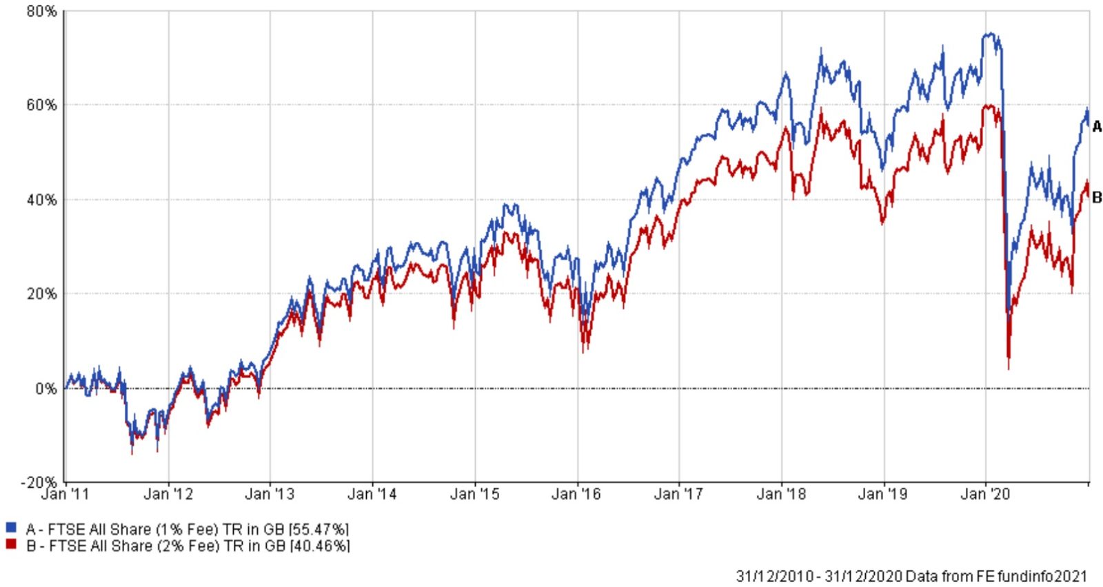 The chart uses two identical investment strategies with 100% allocation into the FTSE All Share. Portfolio A comes with a management fee of 1% and Portfolio B has a management fee of 2%, a cost difference of 1%.